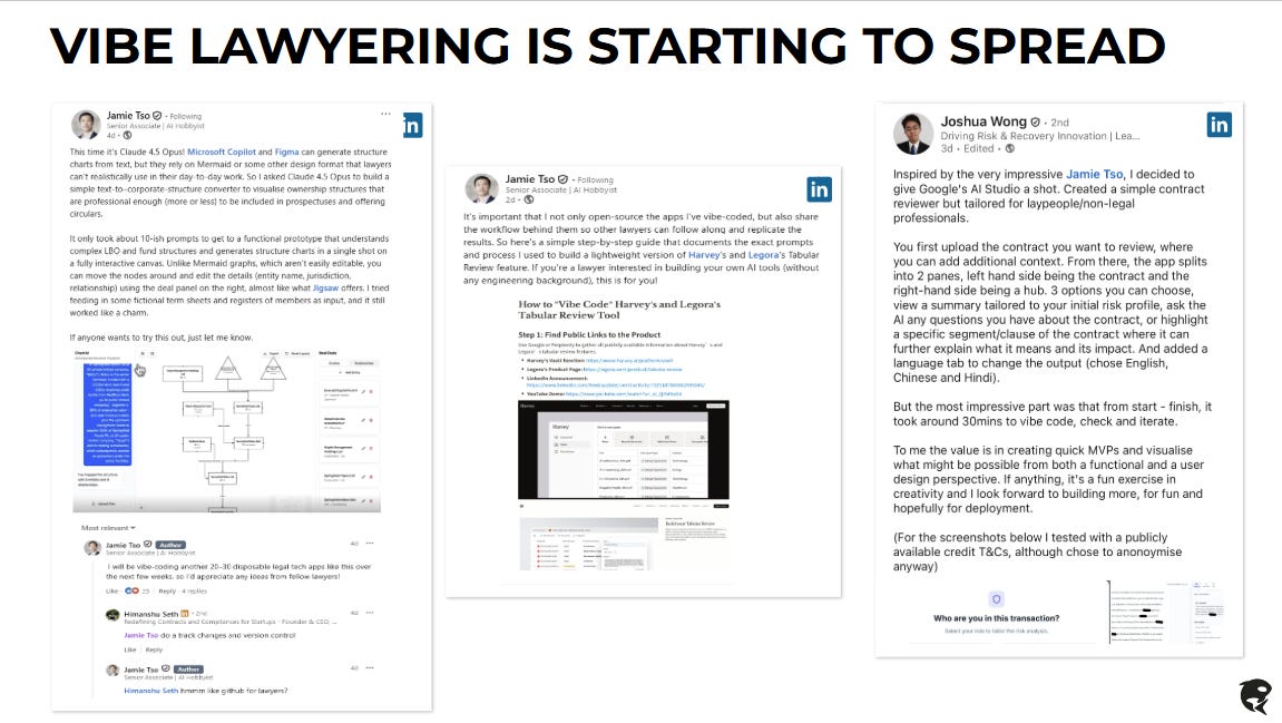 The new poster child of “Code it yourself counsel!” is Jamie Tso, the Hong Kong based lawyer and founder of the Legal Quants community who began replicating features of some of well known legal AI tools and open sourcing them. Other lawyers began taking inspiration from Jamie, something we began immediately flagging to KWS clients.